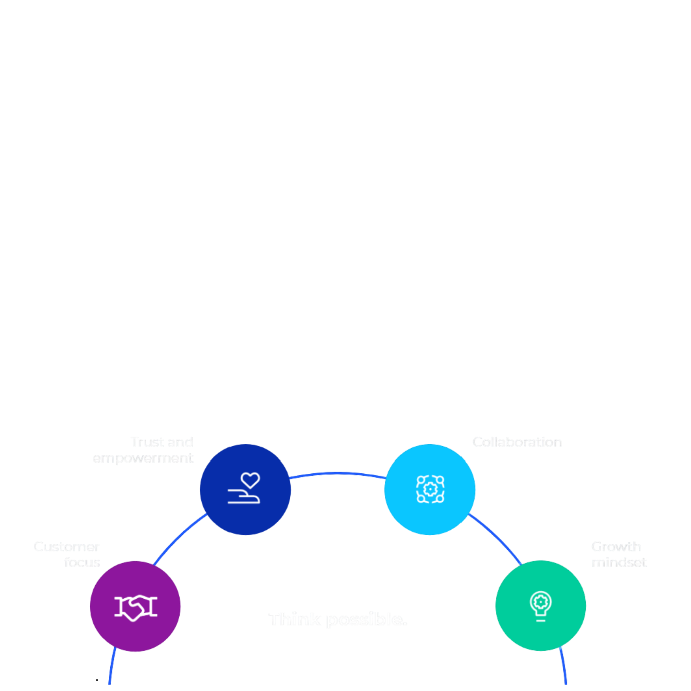 Onze cultuur is een belangrijke enabler van onze nieuwe strategie en is verankerd in de Think possible-mindset van Proximus. Zo vertalen onze wereldwijde teams ambities naar dagelijks gedrag. Vier waarden sturen hoe we samenwerken en groeien: